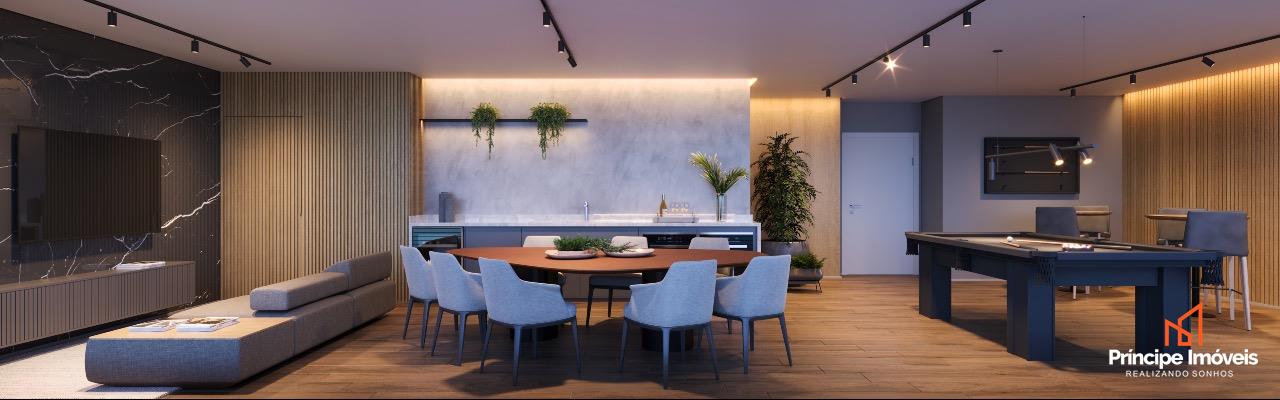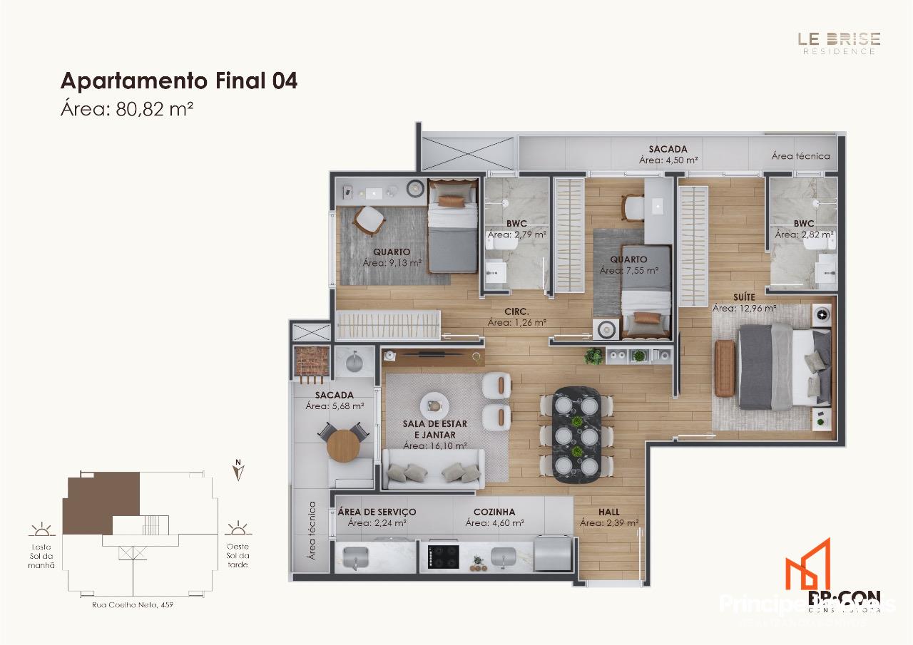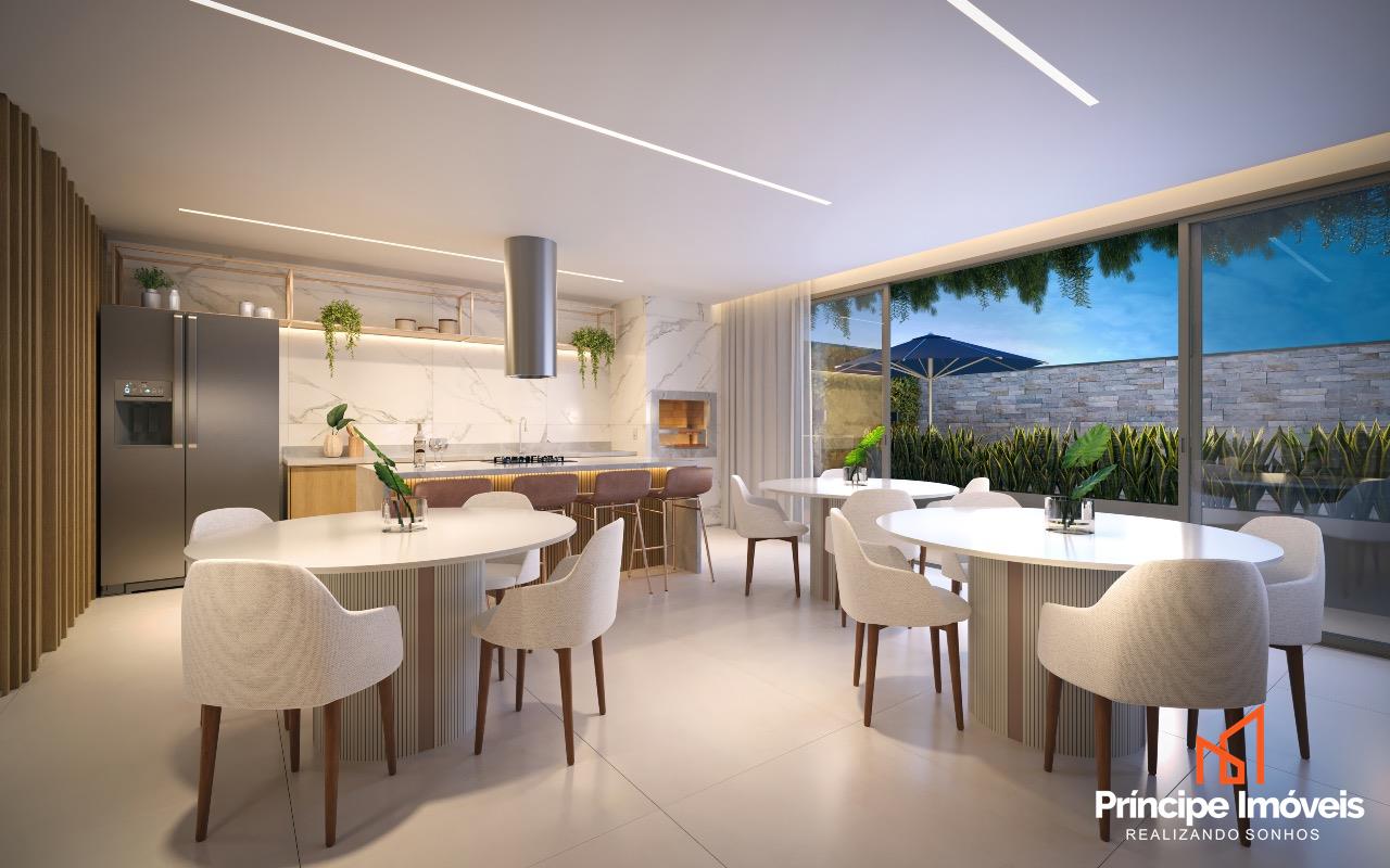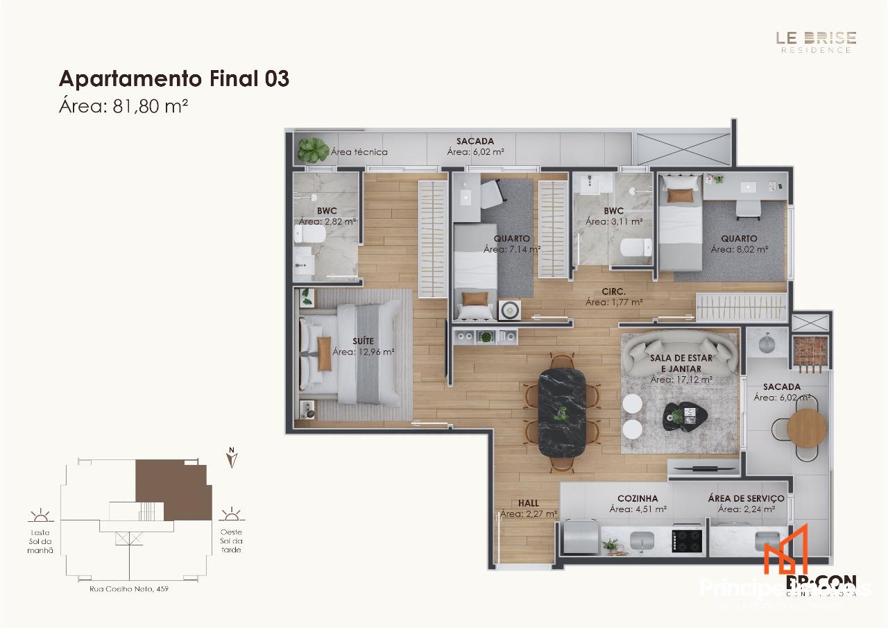 Apartamento: No 4° andar com elevador, possui 81,80m² de área privativa e 117,50m² de área total. O apartamento conta com uma ótima disposição de planta, sendo composto por 3 quartos, sendo 1 suíte com sacada compartilhada com mais um quarto. Conta com área de serviço, cozinha integrada com sala de jantar e sala de estar, tornando o ambiente mais amplo e acolhedor. Na área externa, destaca-se a varanda com churrasqueira a carvão, ideal para momentos em família. Entrega prevista para Março/2026.