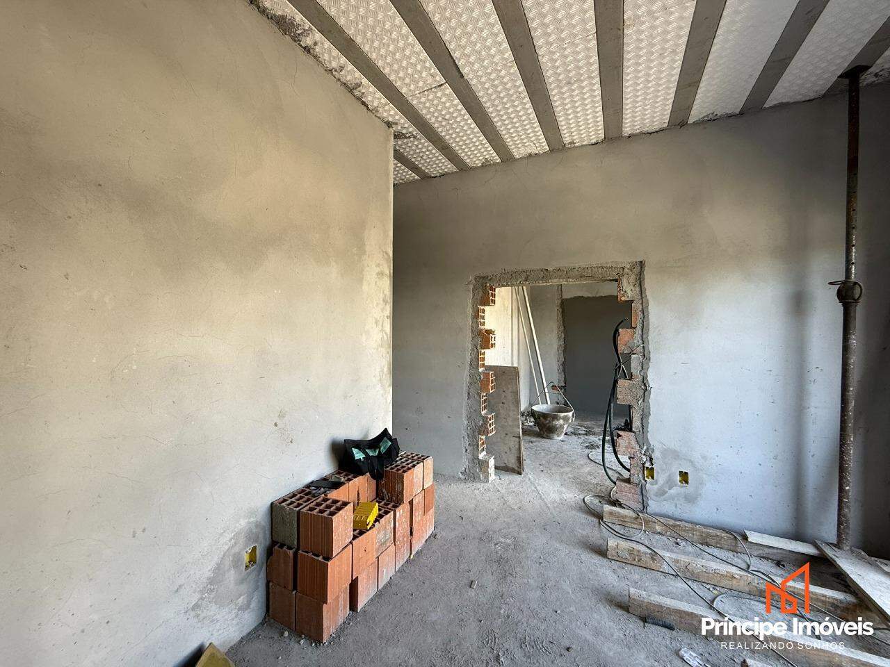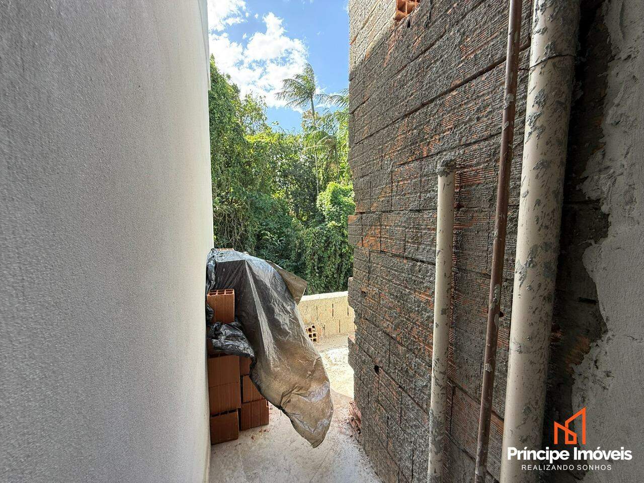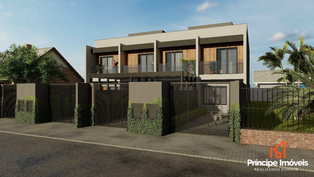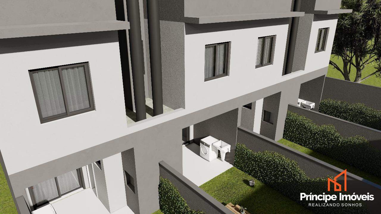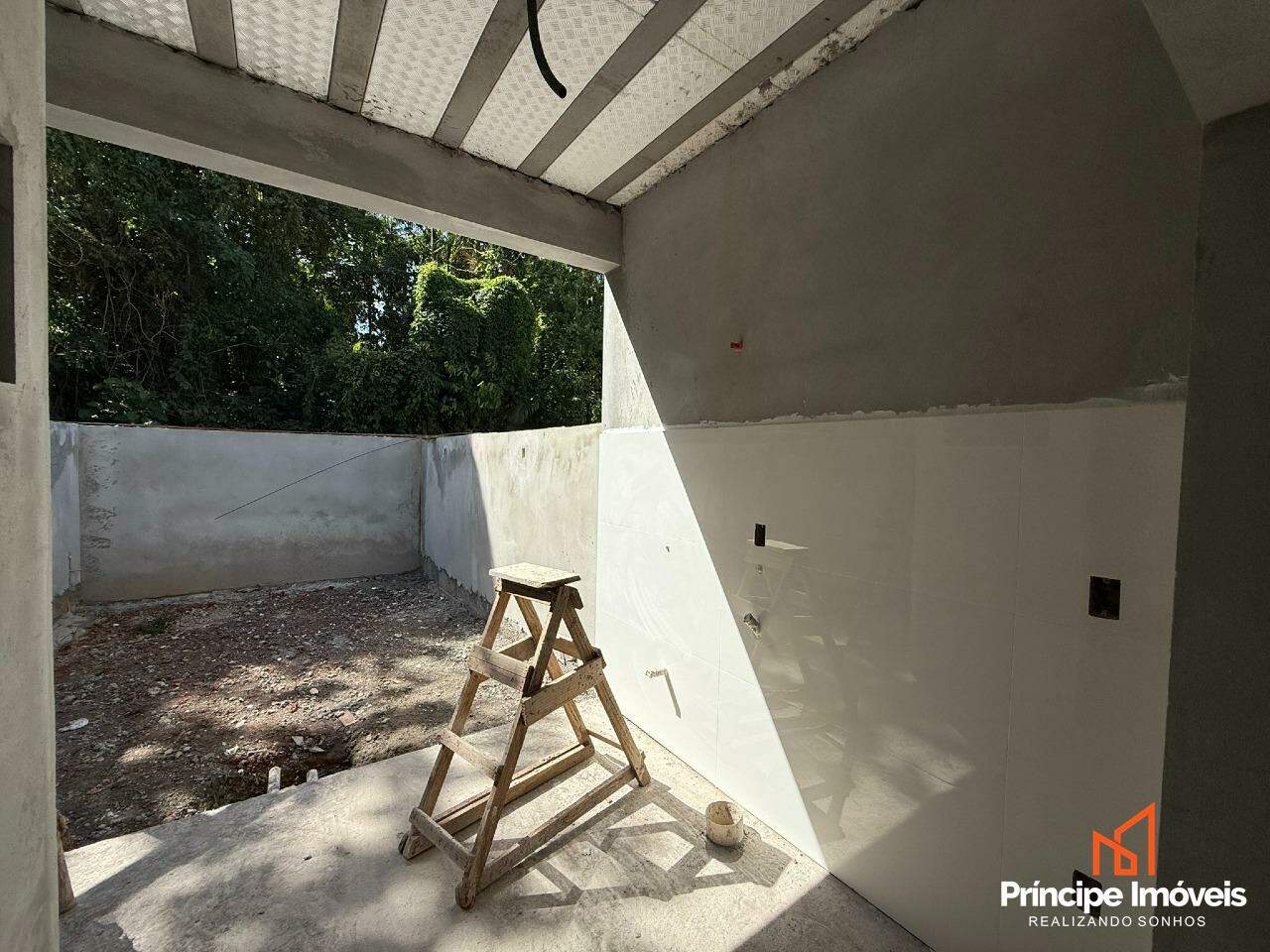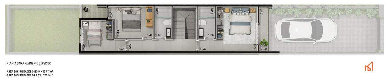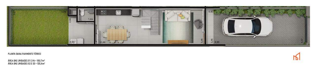 Geminado: Com 03,50 metros de abertura, 10 metros de frente e 05,60 metros de fundos. Este investimento de destaque proporciona 104,08m² de área privativa e 125,53m² de área total. O geminado possui uma distribuição bem projetada contando no piso inferior com 01 sala de estar, 01 cozinha e 01 área de serviço, 01 lavabo e 01 churrasqueira a carvão, 01 vaga coberta com pergolado e vidro e 01 vaga descoberta, no piso superior, são 03 quartos sendo 01 suíte, 01 banheiro social e 01 varanda. Os acabamentos são de alto padrão para oferecer modernidade e elegância, com detalhes em massa corrida e pintura, o piso inferior com porcelanato retificado, piso superior com vinilico, cozinha e banheiros com azulejo retificado, janelas com vidro temperado com aluminio em preto, as portas com porta kit branco, portões de bascular de alumínio preto sem motor, e as vagas de estacionamento com brita e concreto. Entrega prevista de entrega de conclusão de obra Março/2026.